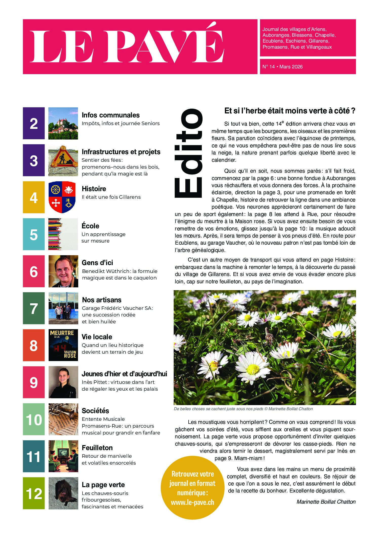Si tout va bien, cette 14e édition arrivera chez vous en même temps que les bourgeons, les oiseaux et les premières fleurs. Sa parution coïncidera avec l’équinoxe de printemps, ce qui ne vous empêchera peut-être pas de nous lire sous la neige, la nature prenant parfois quelque liberté avec le calendrier. Quoi qu’il en soit, nous sommes parés : s’il fait froid, commencez par la page 6 : une bonne fondue à Auboranges vous réchauffera et vous donnera des forces. À la prochaine éclaircie, direction la page 3, pour une promenade en forêt à Chapelle, histoire de retrouver la ligne dans une ambiance poétique. Vos neurones apprécieront certainement de faire un peu de sport également : la page 8 les attend à Rue, pour résoudre l’énigme du meurtre à la Maison rose. Si vous avez ensuite besoin de vous remettre de vos émotions, glissez jusqu’à la page 10 : la musique adoucit les mœurs. Après, il sera temps de penser à vos pneus d’été. En route pour Ecublens, au garage Vaucher, où le nouveau patron n’est pas tombé loin de l’arbre généalogique. C’est un autre moyen de transport qui vous attend en page Histoire : embarquez dans la machine à remonter le temps, à la découverte du passé du village de Gillarens. Et si vous avez envie de vous évader encore plus loin, cap sur notre feuilleton, au pays de l’imagination.
